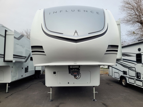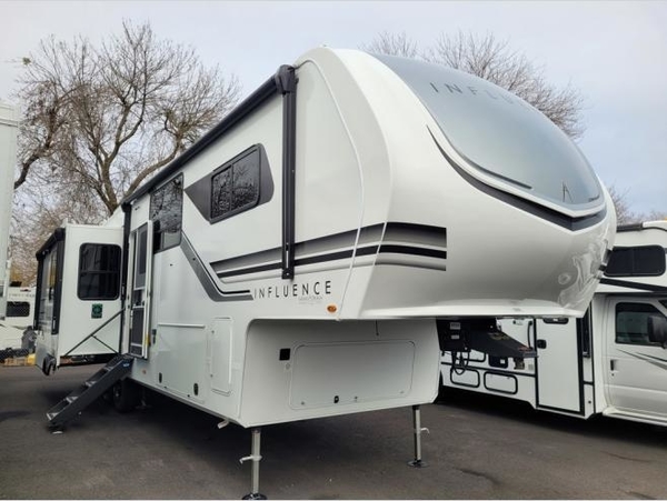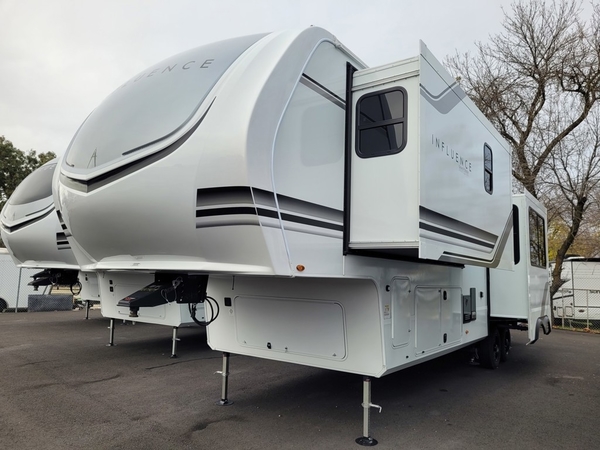 Any Grand Design Influence fifth wheel features five-sided aluminum cage construction with a walk-on roof and a fully enclosed underbelly with heated tanks and storage for all weather camping. For peace of mind, the MORryde CRE3000 Suspension system will provide safe and smooth towing, and the 101" widebody construction offers all the room you need and that is before multiple slides are fully engaged. You will appreciate the Keyed-Alike locks, slam-latch baggage doors with magnetic door catches, exterior security light, and SolidStep entry steps. On the inside, Congoleum flooring, premium roller shades for privacy, a hallway handrail for safety, and nightstands with USB ports to keep all of your electronics fully charged. You will also love the On Demand tankless water heater when showering, plus the added heat and ambiance from an electric fireplace, and so much more!