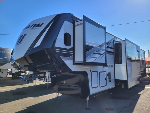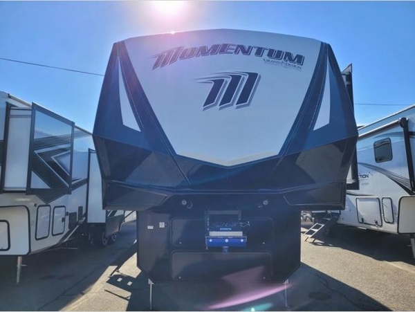 With any Momentum M-Class toy hauler by Grand Design, you will enjoy luxury at every turn! They have been constructed to a superior standard with a thermal roof design, triple insulated main floor and garage floor, and a Rail-Tite underbelly seal that will allow you to camp in all elements. Each model also features an 8' 5" wide body chassis with a wide rail design, no wheel wheels, and a dovetail entry for easier loading. The Stealth A/C system provides maximum cooling power, and the CRE3000 suspension system means you can enjoy a smooth tow each time. You will love the luxurious interior with a professional grade stainless steel cooktop, interior color changing LED accent lighting, a fiberglass shower with a glass door, and solid surface countertops.