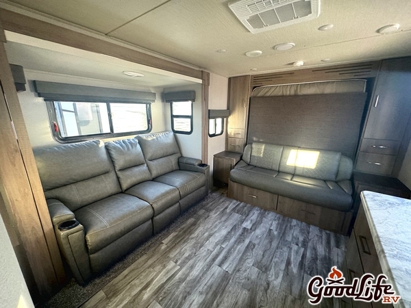 This USED 2022 Grand Design Imagine XLS 17MKE is a compact, lightweight travel trailer designed for couples or small families. It features a modern, open layout with a Murphy bed that folds into a sofa, maximizing space. The trailer includes a full kitchen, a spacious bathroom with a shower, and ample storage. At around 21 feet long and under 5,000 pounds, it is easy to tow while still offering many amenities, including air conditioning, entertainment options, and durable construction designed for both comfort and convenience on the road.  You can find this 17MKE Imagine and many other floorplans at Good Life RV in Webster City, IA.  We do take in trades and we do offer competitive financing options!  Give us a call today! 515-832-5715