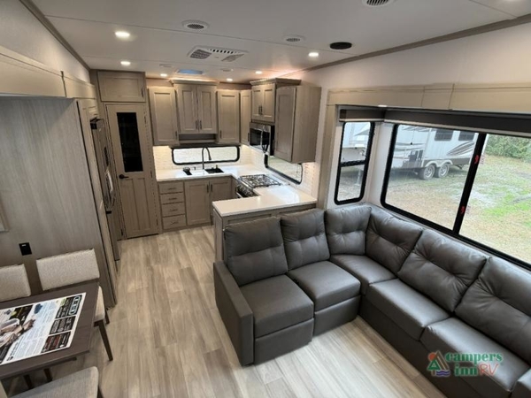 The Grand Design Influence Fifth Wheel boasts impressive durability with its five-sided aluminum cage construction and walk-on roof. The fully enclosed underbelly, complete with heated tanks, ensures you're ready for year-round camping in any weather.