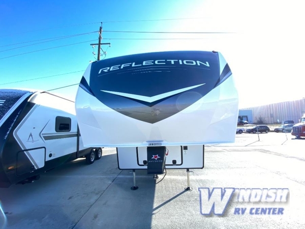 With any Reflection 150 Series fifth wheel by Grand Design, there is more available payload capacity and a broader range of half-ton trucks capable of towing this fifth wheel, and no slider hitch is needed thanks to the 90-degree turning radius which makes them short bed friendly and easier to tow. The mandatory Ultimate Power package provides a "One-Touch" automatic leveling system and a detachable power cord with LED light for easy setup, plus motion sensor pass-through lighting and entry lighting, and the Tire Linc TPMS will help you stay safe on the road. The interior offers residential luxury from the cabinetry and premium Congoleum flooring, to the booth dinette and residential-style window treatment. Make your refined decision today!