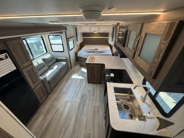This trailer resembles a toy hauler since it includes a ramp door and an optional patio kit if you enjoy spending time outdoors. There is even a camp kitchen here with a sink, refrigerator, TV, and pull-out trash can. The combined kitchen and living area includes a 70" sofa slide, plenty of counter space in the kitchen, and a TV with a soundbar to wash away those rainy day blues. A full bath onboard is another great bonus found within this model. Up front, the semi-private bedroom with a privacy curtain will provide you with your own space to get dressed each morning, and you're sure to enjoy the king bed!