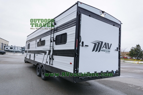 You will love this Momentum MAV toy hauler travel trailer! The front bedroom features a queen bed, and there is plenty of room to walk around. The sliding solid bedroom door helps with space. Overhead storage and a pair of nightstands are convenient storage, plus there is a wardrobe with both drawers and space to hang items. The kitchen offers a microwave, stainless steel sink, and an 8 cu. ft. 12V refrigerator. In the garage, you'll find rollover sofas with a table and a top bed for guests to sleep on. The ramp door/patio will provide additional living space once your toys are unloaded, and the pull down screen will keep bugs out!
