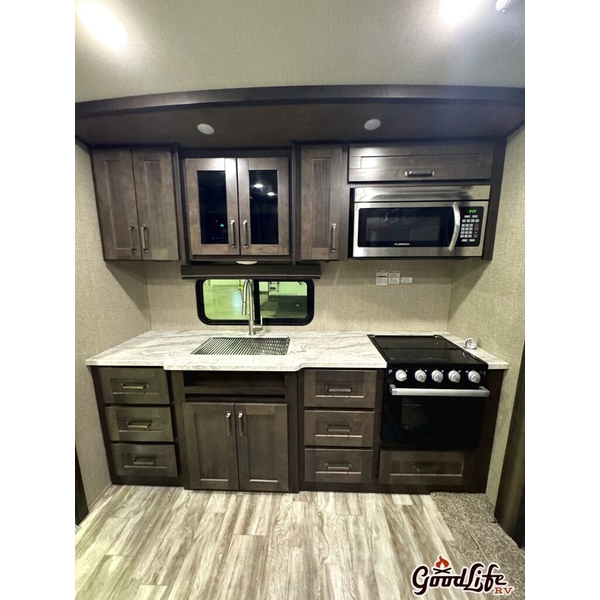 The Reflection 226RK offers a cozy and functional layout suitable for couples or small families. Its rear kitchen design provides ample space for meal preparation, with plenty of countertop space and storage options. The living area is intelligently laid out, offering a comfortable sofa or dinette for relaxation and dining.