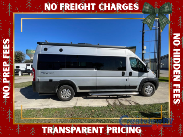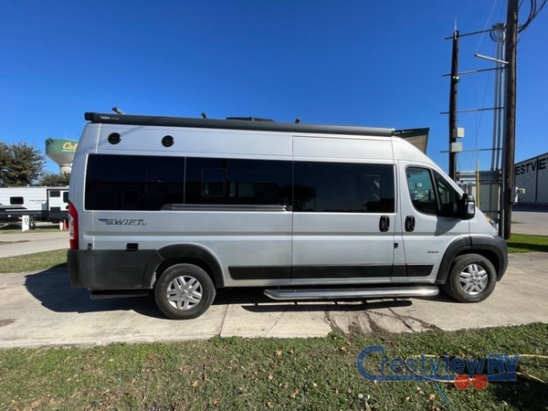 Each Swift Li Class B gas motorhome by Jayco sits upon a RAM ProMaster 3500 window van chassis for strength, and includes custom-molded, vinyl-wrapped ABS interior wall panels for durability. The roof-mounted 200 watt solar panels will allow you to go off the beaten path, and you'll appreciate extra power provided by the 48V - 210 amp hour smart Lithium battery for 10kW hours of power. Luxury features inside include residential vinyl flooring, a soft-touch vinyl ceiling, Tecnoform European-style cabinetry, and a solid surface kitchen countertop. The JayCommand powered by Firefly will let you control your coach's functions from your phone or tablet, and you can stay connected to the outside world with Winegard Connect 2.0 4G/Wi-Fi/digital TV antenna.