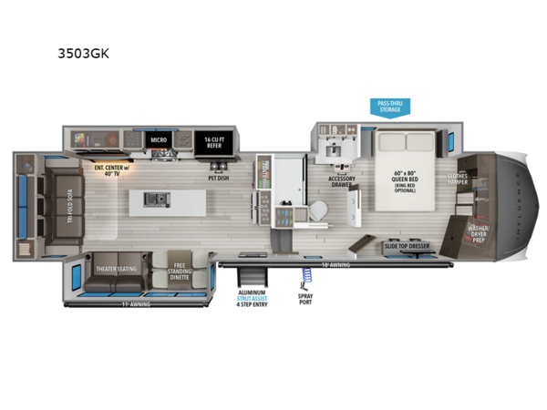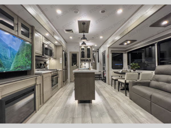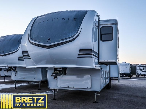 Any Grand Design Influence fifth wheel features five-sided aluminum cage construction with a walk-on roof and a fully enclosed underbelly with heated tanks and storage for all weather camping. For peace of mind, the MORryde CRE3000 Suspension system will provide safe and smooth towing, and the 101" widebody construction offers all the room you need and that is before multiple slides are fully engaged. You will appreciate the Keyed-Alike locks, slam-latch baggage doors with magnetic door catches, exterior security light, and SolidStep entry steps. On the inside, Congoleum flooring, premium roller shades for privacy, a hallway handrail for safety, and nightstands with USB ports to keep all of your electronics fully charged. You will also love the On Demand tankless water heater when showering, plus the added heat and ambiance from an electric fireplace, and so much more!