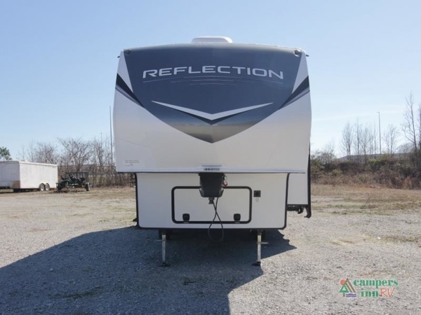 The Reflection 150 Series is designed for half-ton truck towing, offering increased payload capacity and a 90-degree turning radius, eliminating the need for a slider hitch. The Ultimate Power Package makes setup simple with a "One-Touch" automatic leveling system, a detachable power cord with LED lighting, and motion-sensor pass-through lighting for easy access at night. The Tire Linc TPMS keeps you informed about tire pressure for a safer journey.