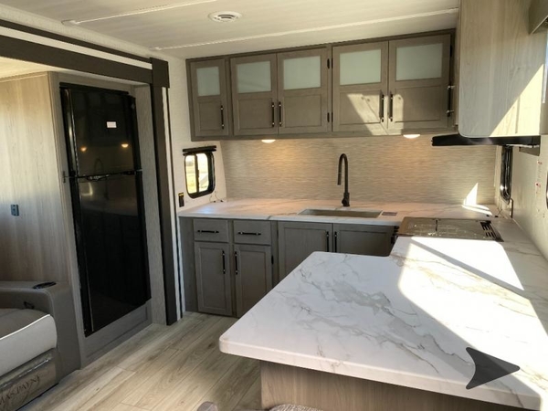 Will you choose to take this travel trailer to the lake or woods? Wherever you choose, you will be met with many comforts. The rear private bedroom includes a queen bed slide out for more floor space plus a desk with a chair if you need to get some work done. A walk-through bath will be easily accessible, and there is a spacious linen closet to keep towels clean. Head to main living room to relax on the tri-fold sofa or make dinner in the front kitchen. The counter with two chairs provides a place to eat breakfast each morning, and the lower pantry will be perfect for extra snacks. This model also includes an outdoor kitchen under the 18' power awning; how convenient!