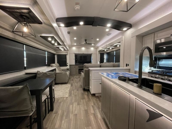Prepare for great adventures in this fifth wheel! The rear living area features a massive L-shaped sofa which includes a hide-a-bed as well as recliner seats! Plus there's an additional set of theater seats all facing the entertainment center with a fireplace and 50" Smart TV. A flexible desk/coffee bar connects the living room to the kitchen so you can work or relax as needed. Meals will be easy to prepare with the island with sink and pull-out cutting board, plus pantry, microwave, and residential refrigerator. Up front you will find the private bedroom with its king bed, closet with drawers and hamper, and even a second TV. The full bath features a shower with seat and a linen closet for convenient storage. Outside you'll find a pair of awnings and a pull-out griddle.