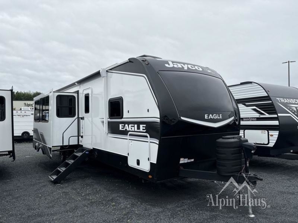With any Eagle HT fifth wheel or travel trailer by Jayco you will enjoy a smooth drive thanks to the 4 Star Handling Package, Goodyear Endurance tires, and MORryde CRE-3000 rubberized suspension. The Customer Value Package includes amenities that are sure to make camping easier than ever, like the 60K on-demand water heater, Keyed-Alike lock system, 15,000 BTU "Whisper Quiet" A/C, and more. Handcrafted and glazed door/drawer fronts will make your space feel more like home, along with residential vinyl flooring throughout, GE appliances, and blackout roller shades with reflective side throughout to keep the sun out when you want to sleep in. Each model also includes a NuVo H2O water treatment system with filters included, interior and exterior "Blue Sync" audio connect with MB Quart Sound for your TV and phone, and 100% no floor vents for added comfort and convenience!