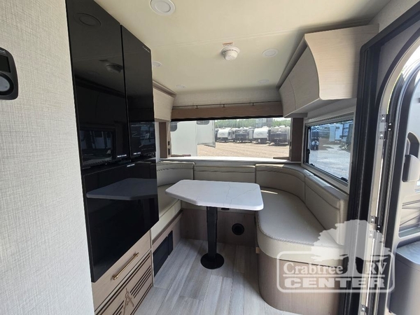 Trips to the lake are made complete in this cozy travel trailer for four. Once you arrive at the campground, you can unload the exterior storage, then start lunch on the induction cooktop and convection microwave. There is a front U-shaped sleeper dinette that will provide dining space and additional sleeping space for guests. This unit includes a private full bath with a shower, toilet, and flip-up bath sink plus some convenient storage for your necessities. You're sure to enjoy sleeping on the rear queen bed that includes wraparound overhead storage for your things!