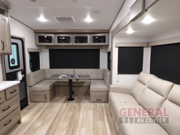 With any Reflection 150 Series fifth wheel by Grand Design, there is more available payload capacity and a broader range of half-ton trucks capable of towing this fifth wheel, and no slider hitch is needed thanks to the 90-degree turning radius which makes them short bed friendly and easier to tow. The mandatory Ultimate Power package provides a "One-Touch" automatic leveling system and a detachable power cord with LED light for easy setup, plus motion sensor pass-through lighting and entry lighting, and the Tire Linc TPMS will help you stay safe on the road. The interior offers residential luxury from the cabinetry and premium Congoleum flooring, to the booth dinette and residential-style window treatment. Make your refined decision today!