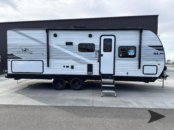 The Jayco Jay Flight SLX travel trailer is quite easy to own because it is lightweight for an easier towing experience. Built on a fully integrated A-frame with galvanized-steel, impact-resistant wheel wells, the Jay Flight SLX has quality at its very foundation. That quality continues on to the electric self-adjusting brakes, easy-lube hubs, Magnum Truss roof system, and LP quick connect. Some of what the mandatory Customer Value Package includes is backup camera prep, Keyed-Alike entry and baggage doors, marine grade exterior speakers, and an on-demand tankless water heater