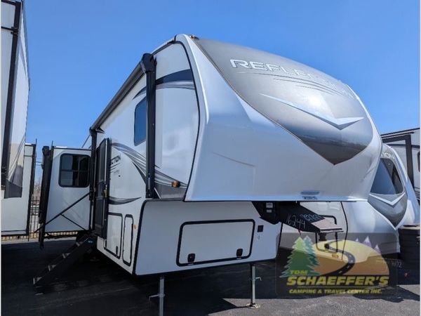 With any Reflection fifth wheel by Grand Design, you will have a solar panel for off-grid camping and a 60 amp charge controller and inverter prep, a Universal All-In-One docking station, unobstructed pass-through storage, and Goodyear Endurance tires. Each is constructed of gel coat exterior sidewalls, residential 5" truss rafters, walk-on roof decking, a fiberglass and radiant foil roof and front cap insulation plus laminated aluminum framed side walls, roof and end walls in slide rooms. Head inside to enjoy residential hardwood cabinet doors, premium Congoleum flooring, a spacious shower with a glass door, and many more comforts!
