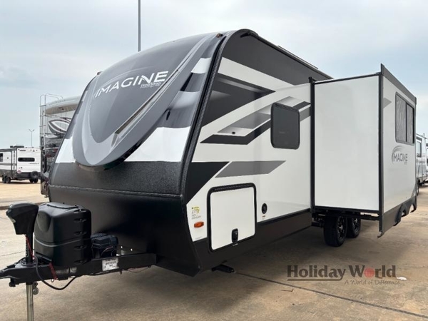 Just imagine leaving the world behind and secluding yourself away with your favorite people in your Grand Design Imagine travel trailer! The Imagine has been designed to enjoy extended season camping and includes a high-capacity furnace, a heated and enclosed underbelly with suspended tanks, a designated heat duct to the subfloor, and a high-density roof insulation with attic vent. You'll have maximum head room on the interior with 81" radius ceilings, and large panoramic windows to let in natural lighting. The exclusive drop-frame pass-through storage compartment is going to allow you to bring along lots of equipment, and the universal docking station is an all-in-one location for utilities and hook-ups. You'll also have industry-leading tank capacities so that you can fill and empty your tanks less often.