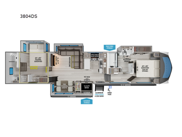 The living area is perfect for relaxing and entertaining. An L-shaped reclining sofa faces an electric fireplace and entertainment center. The free-standing dinette and gourmet kitchen make meal prep and dining easy. The kitchen includes a 16 cu. ft. 12V refrigerator with inverter prep and 330W solar panel, solid countertops, and a pull-out pet dish. Options like the Influence Residential Living Package, Elite Kitchen Package, and dual patio awnings elevate comfort indoors and out. Triple 15K BTU A/C units with heat pump, 12V tank heaters, Weather-Tek protection, and 4-season insulation ensure you stay comfortable year-round.