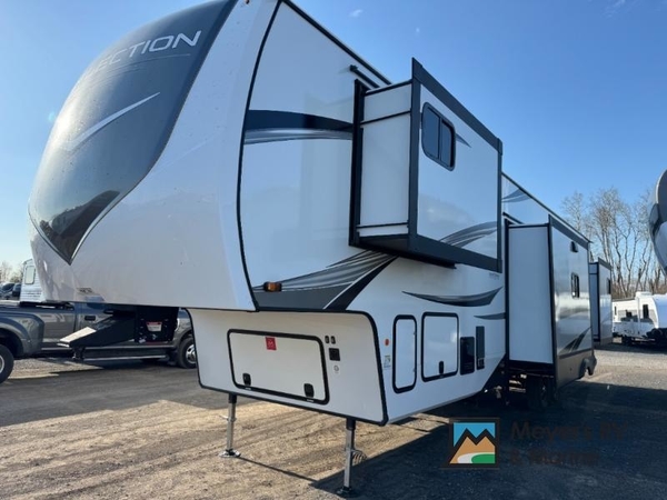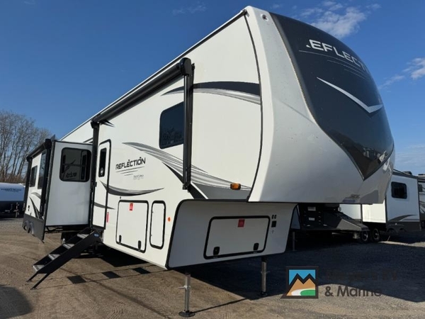 With any Reflection fifth wheel by Grand Design, you will have a solar panel for off-grid camping and a 60 amp charge controller and inverter prep, a Universal All-In-One docking station, unobstructed pass-through storage, and Goodyear Endurance tires. Each is constructed of gel coat exterior sidewalls, residential 5" truss rafters, walk-on roof decking, a fiberglass and radiant foil roof and front cap insulation plus laminated aluminum framed side walls, roof and end walls in slide rooms. Head inside to enjoy residential hardwood cabinet doors, premium Congoleum flooring, a spacious shower with a glass door, and many more comforts!