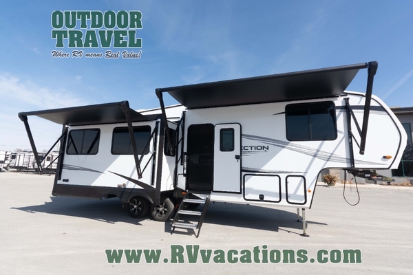 Get ready to enjoy everything the campgrounds and surrounding area has to offer when you are setup to camp in this fifth wheel! The two electric awnings offer protected areas creating outdoor living spaces; just grab your camping chairs from the unobstructed pass-through storage. And the interior offers a spacious living area and kitchen combination with dual opposing slides for maximum space. You can sit on the tri-fold sofa or the booth dinette with an option for a swivel dinette. The hutch and kitchen island offer counter space to prepare and serve meals, and there is a large pantry for goodies. The 40" LED HDTV with a fireplace below provides entertainment before bedtime or on a rainy day. And the front bedroom offers privacy, a walk-around queen bed, and plenty of storage!