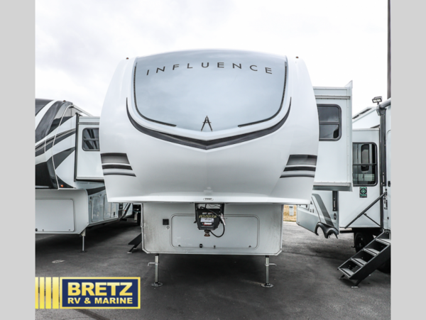 Any Grand Design Influence fifth wheel features five-sided aluminum cage construction with a walk-on roof and a fully enclosed underbelly with heated tanks and storage for all weather camping. For peace of mind, the MORryde CRE3000 Suspension system will provide safe and smooth towing, and the 101" widebody construction offers all the room you need and that is before multiple slides are fully engaged. You will appreciate the Keyed-Alike locks, slam-latch baggage doors with magnetic door catches, exterior security light, and SolidStep entry steps. On the inside, Congoleum flooring, premium roller shades for privacy, a hallway handrail for safety, and nightstands with USB ports to keep all of your electronics fully charged. You will also love the On Demand tankless water heater when showering, plus the added heat and ambiance from an electric fireplace, and so much more!