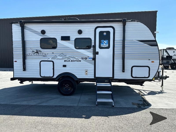 This single-axle couple's travel trailer is sure to bring you happiness at the campground. There is a front queen bed with a privacy curtain if you have a guest staying over on the jack-knife sofa, and the movable table in front of the sofa will provide more floor space when needed. A cooktop and microwave oven will let you make meals each day, and an 8 cu. ft. 12V refrigerator will be perfect for perishables. This model also includes a full rear bath with a tub/shower, a toilet, plus a sink and a linen closet for clean towels. The optional Baja Package can be added on this model which includes 16 in. off-road tires, a deluxe graphics package, triple entry steps, and more!