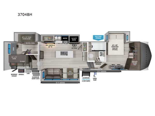 Grab the whole gang and head out in this fifth wheel featuring a private bunkhouse that sleeps five. This unit also features dual entry doors for added convenience with one set leading into a half bath, and quad slides for even more space in this widebody layout. The combined kitchen and living area featuring dual opposing slides offer space to dine and relax including theater seating for two opposite the entertainment center and fireplace. The chef in your group will appreciate the amenities for dreaming up dishes to feed everyone, and the outside griddle, sink and beverage cooler provides even more options. In front, a private bedroom and full bath with a queen bed or optional king, your choice. You can even add a washer and dryer with a space in front prepped for both if you like.