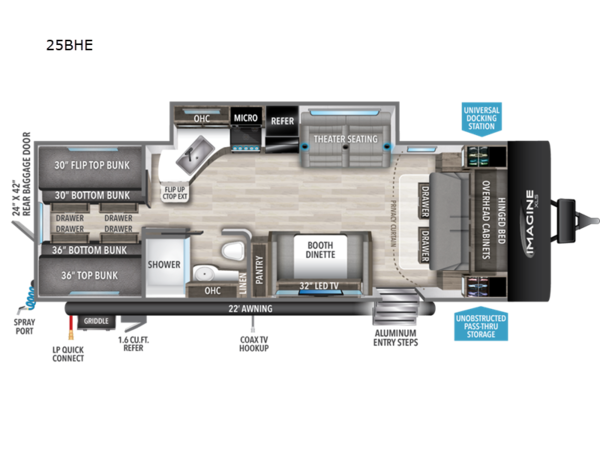 This Imagine XLS 25BHE travel trailer has two bedroom areas so everyone can have their own space! Up front behind a privacy curtain is a hinged bed with tons of storage, including drawers beneath, dual wardrobes, and overhead cabinets. At the rear is a bunkhouse with four bunks, also with drawers beneath. The kitchen is spacious with a flip-up countertop for an expanded work area. You'll appreciate the pantry storage as well. The booth dinette is directly across from the theater seats which makes for a nice conversation area. You might spend more time outdoors with features like an exterior kitchen with a griddle and a 1.6 cu. ft. refrigerator, plus a 22' awning. There's even more storage outside with a pass-through storage and a rear baggage door.