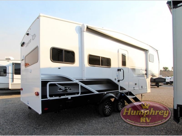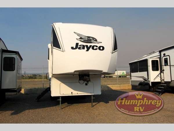 With any Eagle SLE fifth wheel by Jayco, you will enjoy a lighter tow weight, high-end finishes, and the same quality construction you've come to expect from Jayco! There is an Alpha Ply TPO roof membrane, a fully enclosed and heated underbelly, plus Stronghold VBL walls for added durability. There is also a rear 2" towing receiver outside, along with metal slam latch baggage doors, MORryde Step Above entry steps, and a Winegard Air 360 antenna with router prep if you want to stay connected as you camp. Once inside you'll enjoy the handcrafted and glazed door/drawer fronts, blackout pleated shades throughout, and residential vinyl flooring throughout with no carpet for an easier clean. The on-demand water heater, 30K BTU furnace, and 15K BTU "Whisper Quiet" A/C will ensure your comfort year around, and the optional Overland 1 Solar Package can be added if you need off-grid capabilities!
