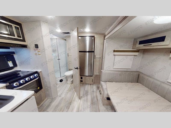 Versatile, cozy, and spacious are just a few ways to describe this travel trailer! Once you arrive at the campsite, unload your gear from the pass-through storage and additional exterior storage, then set up the 15' power awning with LED lights. You may want to visit in your camp chairs, or head inside to prepare lunch on the three burner cooktop. There is a U-shaped dinette within the slide out, plus a wardrobe here for jackets or your guests' clothes. You will also find the 72" sofa is a comfy spot to relax, and at night, you can fold down the RV queen-size Murphy bed!