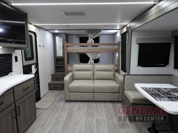 Camping with your larger family or when you want to take along a few extra friends is easy with this trailer. This unit sleeps nine with the double-size bunks in the rear corner, the 60" roll over sofa, and the queen bed in the front semi-private bedroom. The booth dinette can also be used to sleep a guest or two little ones at night once converted. Prepare your meals on the three-burner cooktop indoors, or out on the two-burner cooktop at the outside kitchen! You'll also find a handy exterior spray port and an outdoor refrigerator for cold drinks! It will be so easy to fill the dog's food bowl with the added pet dish under the refrigerator, and the full bath in this model means you don't have to use the camp's facilities. Having a 17' awning outside along with a large unobstructed pass-through compartment allows you extended living outdoors and plenty of space for all of your gear!