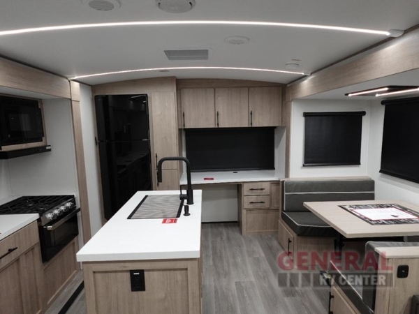 With this Imagine travel trailer, you can work while you're on the road because it offers you a desk in the main living area. You won't have to miss out on the action since you'll be right next to the booth dinette and theater seats, and there is even a pantry directly to the left of the desk for you to grab a quick snack while you're working. Once you're done with work, you can relax on the theater seat while you watch the telescoping LED HDTV, and the private bedroom offers you a 60" x 80" queen bed to rest on when you're ready to call it a night.