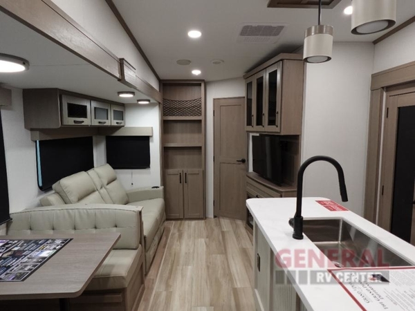 Are you looking to travel with your family and friends and want enough space for everyone to be comfortable? Step inside using the Step Above wit lift assist entry steps, to find a private bunkhouse in the rear of this fifth wheel which offers a slide out flip bunk above a tri-fold sofa, a 44" bunk bed with window and storage below, plus its very own private half bathroom. The theater seating is a great place to unwind at night in front of the entertainment center with a 40" LED HDTV and fireplace below it. There is a dinette , and the kitchen island will provide more counter space to prep meals. You will find full amenities including a 16 cu. ft. 12V refrigerator and a hutch. This fifth wheel also includes a double entry bathroom with a radius shower, and you can wake up refreshed each morning after sleeping on your own bed.