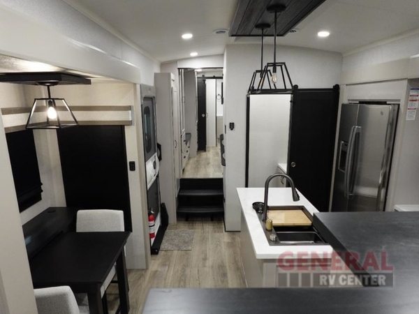 Entertainment can be found throughout this fifth wheel from the front living area with a 50" Smart LED HDTV with fully digital HDMI output and home entertainment system with subwoofer including a fireplace below that you can enjoy while relaxing on theater seats and two tri-fold sofas, a 32" TV in the middle kitchen and there is a bedroom 32" TV. Back inside the kitchen, the cook will love the center island, the pantry, the residential refrigerator, and the roll-top dinette. The half bath is a few steps away as an added convenience. The master bedroom includes a king bed slide, a bench, two wardrobes and a sliding door into the bathroom which offers two sinks and a walk-in shower. And don't forget about the exterior features such as the outside kitchen for more choices when making meals, the storage for your outdoor gear and chairs, and two awnings with integrated LED lighting.