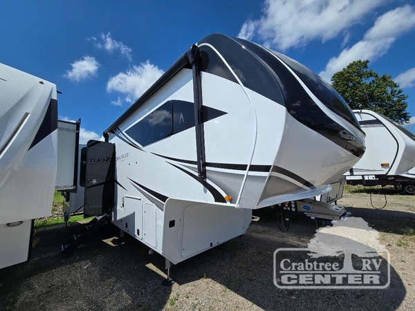 Each Solitude fifth wheel by Grand Design features a 101" wide-body construction, heavy duty 8,000 lb. axles, frameless tinted windows, and high-gloss gel coat sidewalls. You can camp year around thanks to the Weather-Tek Package that includes a 35K BTU high-capacity furnace, an all-in-one enclosed and heated utility center, and a fully enclosed underbelly with heated tanks and storage. Inside, you'll love the premium roller shades, hardwood cabinet doors, solid surface countertops, plus residential finishes throughout to make you truly feel at home. Each model also includes a MORryde CRE3000 suspension system, self adjusting brakes, and a MORryde pin box that will provide smooth towing from home to campground. Affordable luxury is possible with the Solitude fifth wheels; choose yours today!