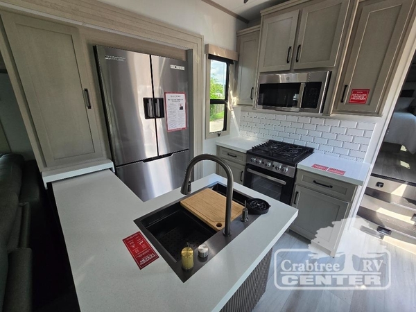 You want a toy hauler to carry your toys to the trails, and include many at-home comforts, and that's just what this unit delivers. A 14' separate garage includes an adjustable tie-down system, an optional Lifesuite System for more sleeping space, an optional half bath, plus washer and dryer prep. There is an overhead loft bed and an L-shaped sofa with recline in the main living area that offers sleeping space as well. Everyone can watch a movie on the LED TV with a fireplace below while sitting on the sofa, in the theatre seats, or while at the free standing dinette with four chairs. The chef will have upgraded appliances to make meals for everyone, an L-shaped countertop with a kitchen sink, and a USB charging outlet. You will love the shower with seat in the full bathroom with two space savings sliding doors that lead into the hallway, and into the front bedroom where you will have a walk-around queen bed, a slide out wardrobe and more USB charging outlets.