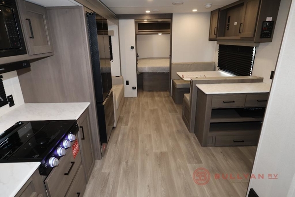 It will be so easy to enjoy camping trips in this travel trailer for five to six! The main living area is made spacious by the large slide out, and here you'll find the 60" sleeper sofa and the kitchen appliances. A booth dinette across the room provides a place to dine and play board games, or you can head outdoors to sit under the 17' power awning with LED lights. The queen bed in the front private bedroom will have you feeling right at home, and the TV prep here gives you the option to watch movies in bed. This model also includes a rear corner kitchen with ample counter space and a large sink, and you'll find the full bath in the other rear corner!
