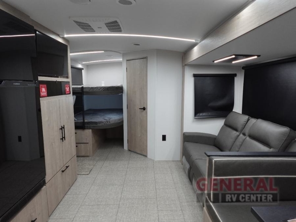 Where will you go with this Imagine travel trailer? The possibilities are endless! You can take your family on an exciting excursion because this trailer has enough sleeping space for everyone with a 60" x 80" queen bed in the private bedroom, a U-shaped dinette and tri-fold sofa in the main living area, and there is a set of 47" x 76" bunk beds with privacy curtains in the rear corner. You can come and go as you please with two entry doors, and the outdoor griddle and refrigerator will be fun to use when the weather is nice. The flip-up countertop extension will make it easier to prepare delicious home cooked meals and the shoe storage area helps to keep things neat and tidy.