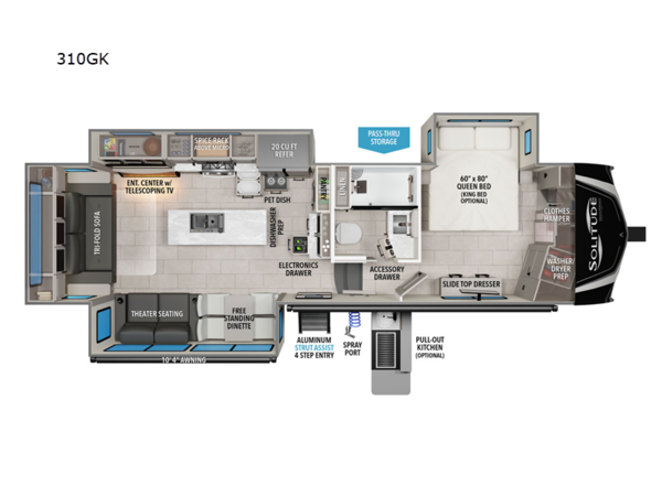Traveling for long periods at a time is made easy with this gourmet kitchen that can feed your entire group a holiday meal! The professional-grade stainless steel cooktop with a built-in oven, microwave, 12V 20 cu. ft. refrigerator, and a kitchen island offers everything you will need to enjoy cooking for your family and guests. There is abundant storage throughout multiple overhead cabinets, a kitchen pantry and hutch, a bath linen cabinet for your towels, and in the front master bedroom which features a large closet. You will also find a closet with washer/dryer prep, large wardrobe, a clothes hamper plus a slide top dresser. Two nice awnings will provide outdoor living space keeping you protected from the sun and rain.