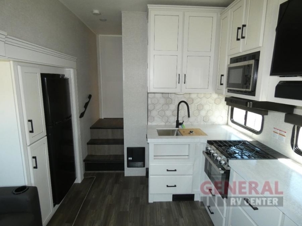 You'll have everything you need in this fifth wheel for enjoyable trips to the lake. Once you arrive at your destination, set up the 16' power awning with LED lights, grab the fishing poles from the pass-through storage, and relax with a cold drink. You and your group can head inside to play a game around the U-shaped dinette or relax on the theater seat across from the TV. The full kitchen includes a black 17" range, a GE microwave, plus a 12V refrigerator for perishables, and the full bath will let you clean up each day. When you're ready to call it a night, head to the front private bedroom for a great night's rest on the queen bed with dual wardrobes, while your guests sleep on the dinette!
