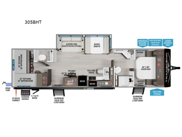 With any Transcend travel trailer by Grand Design, you will enjoy upscale appointments and convenient amenities to make each camping experience one to remember! The Quad Seal technology, residential insulated walls, plus heated and enclosed underbelly with suspended tanks make these units solid and durable. There is a black automotive glass door outside, along with a Safe-T-Rail assist on the main entry door, backup camera prep, and a universal docking station. JBL interior and exterior speakers plus a JBL head unit will let you listen to your favorite tunes as you visit under the power awning with LED strip lights. Inside, you'll enjoy multiple outlets to keep your gadgets charged, thermoformed and seamless countertops, and a 6' 6" interior height so you won't feel closed in. The Solar Prep Package will allow you to enjoy off-grid capabilities with a 200W solar panel, which is wired for up to 600W, a 30 AMP Bluetooth solar controller, a 2000W inverter prep, and more!