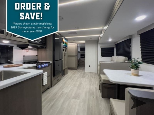 Your crew of nine will love camping in this spacious travel trailer! There are four bunks in the rear bunkhouse, along with storage drawers, and a convenient half bath! A full walk-thru bath will create a front master bedroom you are sure to love, especially with its queen bed, wardrobe storage, and private exterior entry door! The main living area will be a favorite place to hang out with its booth dinette, sleeper sofa and 32" TV. If the weather is nice, you may just find yourselves outdoors since there is an exterior griddle and 1.7 cu. ft. refrigerator!