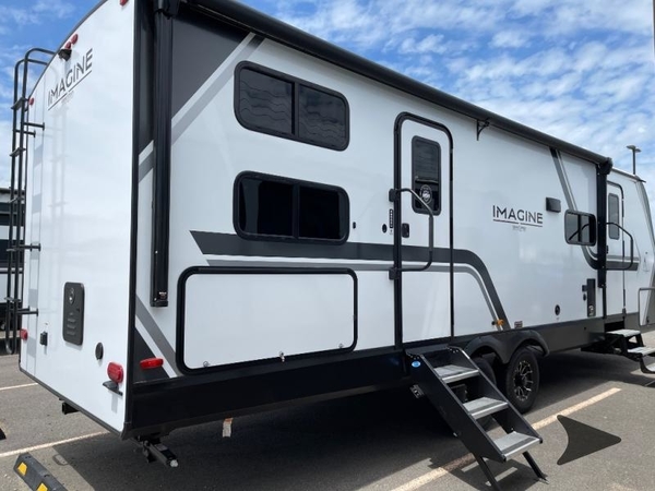 Where will you go with this Imagine travel trailer? The possibilities are endless! You can take your family on an exciting excursion because this trailer has enough sleeping space for everyone with a 60" x 80" queen bed in the private bedroom, a U-shaped dinette and tri-fold sofa in the main living area, and there is a set of 47" x 76" bunk beds with privacy curtains in the rear corner. You can come and go as you please with two entry doors, and the outdoor griddle and refrigerator will be fun to use when the weather is nice. The flip-up countertop extension will make it easier to prepare delicious home cooked meals and the shoe storage area helps to keep things neat and tidy.