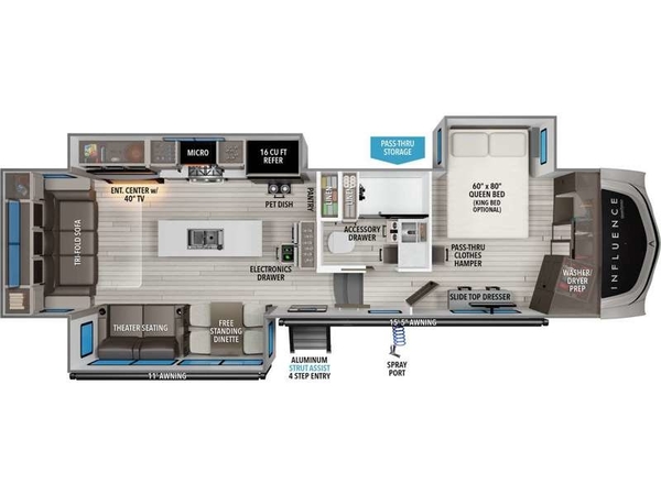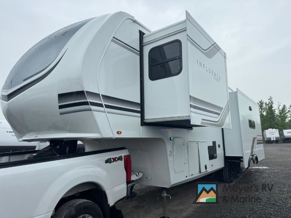 Any Grand Design Influence fifth wheel features five-sided aluminum cage construction with a walk-on roof and a fully enclosed underbelly with heated tanks and storage for all weather camping. For peace of mind, the MORryde CRE3000 Suspension system will provide safe and smooth towing, and the 101" widebody construction offers all the room you need and that is before multiple slides are fully engaged. You will appreciate the Keyed-Alike locks, slam-latch baggage doors with magnetic door catches, exterior security light, and SolidStep entry steps. On the inside, Congoleum flooring, premium roller shades for privacy, a hallway handrail for safety, and nightstands with USB ports to keep all of your electronics fully charged. You will also love the On Demand tankless water heater when showering, plus the added heat and ambiance from an electric fireplace, and so much more!