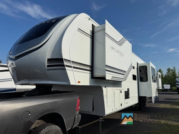 Any Grand Design Influence fifth wheel features five-sided aluminum cage construction with a walk-on roof and a fully enclosed underbelly with heated tanks and storage for all weather camping. For peace of mind, the MORryde CRE3000 Suspension system will provide safe and smooth towing, and the 101" widebody construction offers all the room you need and that is before multiple slides are fully engaged. You will appreciate the Keyed-Alike locks, slam-latch baggage doors with magnetic door catches, exterior security light, and SolidStep entry steps. On the inside, Congoleum flooring, premium roller shades for privacy, a hallway handrail for safety, and nightstands with USB ports to keep all of your electronics fully charged. You will also love the On Demand tankless water heater when showering, plus the added heat and ambiance from an electric fireplace, and so much more!