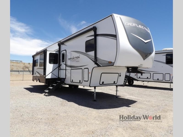 With any Reflection fifth wheel by Grand Design, you will have a solar panel for off-grid camping and a 60 amp charge controller and inverter prep, a Universal All-In-One docking station, unobstructed pass-through storage, and Goodyear Endurance tires. Each is constructed of gel coat exterior sidewalls, residential 5" truss rafters, walk-on roof decking, a fiberglass and radiant foil roof and front cap insulation plus laminated aluminum framed side walls, roof and end walls in slide rooms. Head inside to enjoy residential hardwood cabinet doors, premium Congoleum flooring, a spacious shower with a glass door, and many more comforts!