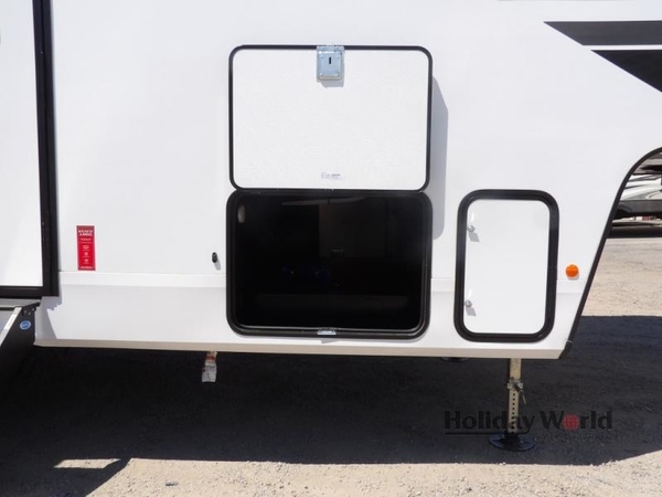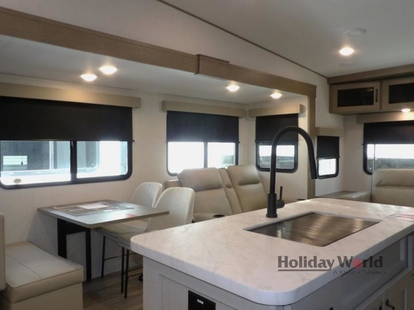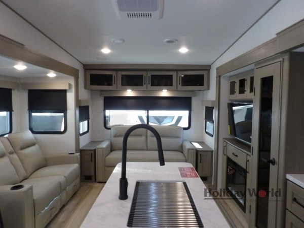 Get ready to enjoy everything the campgrounds and surrounding area has to offer when you are setup to camp in this fifth wheel! The two electric awnings offer protected areas creating outdoor living spaces; just grab your camping chairs from the unobstructed pass-through storage. And the interior offers a spacious living area and kitchen combination with dual opposing slides for maximum space. You can sit on the tri-fold sofa or the booth dinette with an option for a swivel dinette. The hutch and kitchen island offer counter space to prepare and serve meals, and there is a large pantry for goodies. The 40" LED HDTV with a fireplace below provides entertainment before bedtime or on a rainy day. And the front bedroom offers privacy, a walk-around queen bed, and plenty of storage!