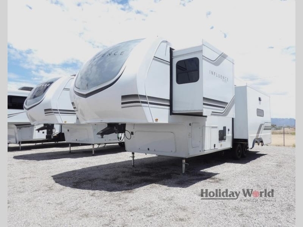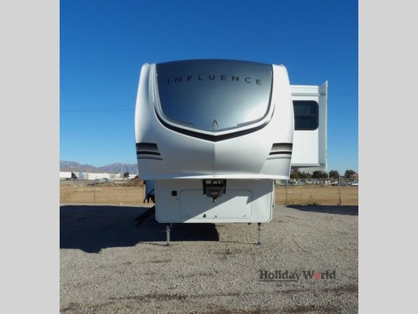 Any Grand Design Influence fifth wheel features five-sided aluminum cage construction with a walk-on roof and a fully enclosed underbelly with heated tanks and storage for all weather camping. For peace of mind, the MORryde CRE3000 Suspension system will provide safe and smooth towing, and the 101" widebody construction offers all the room you need and that is before multiple slides are fully engaged. You will appreciate the Keyed-Alike locks, slam-latch baggage doors with magnetic door catches, exterior security light, and SolidStep entry steps. On the inside, Congoleum flooring, premium roller shades for privacy, a hallway handrail for safety, and nightstands with USB ports to keep all of your electronics fully charged. You will also love the On Demand tankless water heater when showering, plus the added heat and ambiance from an electric fireplace, and so much more!