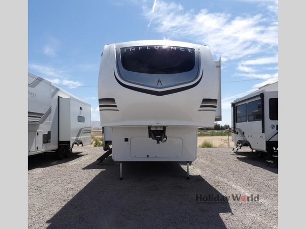 Any Grand Design Influence fifth wheel features five-sided aluminum cage construction with a walk-on roof and a fully enclosed underbelly with heated tanks and storage for all weather camping. For peace of mind, the MORryde CRE3000 Suspension system will provide safe and smooth towing, and the 101" widebody construction offers all the room you need and that is before multiple slides are fully engaged. You will appreciate the Keyed-Alike locks, slam-latch baggage doors with magnetic door catches, exterior security light, and SolidStep entry steps. On the inside, Congoleum flooring, premium roller shades for privacy, a hallway handrail for safety, and nightstands with USB ports to keep all of your electronics fully charged. You will also love the On Demand tankless water heater when showering, plus the added heat and ambiance from an electric fireplace, and so much more!