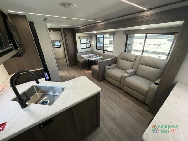 With any Transcend travel trailer by Grand Design, you will enjoy upscale appointments and convenient amenities to make each camping experience one to remember! The Quad Seal technology, residential insulated walls, plus heated and enclosed underbelly with suspended tanks make these units solid and durable. There is a black automotive glass door outside, along with a Safe-T-Rail assist on the main entry door, backup camera prep, and a universal docking station. JBL interior and exterior speakers plus a JBL head unit will let you listen to your favorite tunes as you visit under the power awning with LED strip lights. Inside, you'll enjoy multiple outlets to keep your gadgets charged, thermoformed and seamless countertops, and a 6' 6" interior height so you won't feel closed in. The Solar Prep Package will allow you to enjoy off-grid capabilities with a 200W solar panel, which is wired for up to 600W, a 30 AMP Bluetooth solar controller, a 2000W inverter prep, and more!