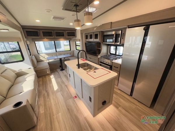 The rear living area is built for comfort and entertaining 78" triple theater seats face a 40" TV and fireplace, and a 92" U-shaped lounge with table provides extra seating and dining space. The gourmet kitchen includes a large island, 16 cu. ft. residential refrigerator and pantry. Outside, enjoy an exterior kitchen with griddle and a 1.6 cu. ft. fridge, plus LP quick connect and a spray port for easy cleanup.