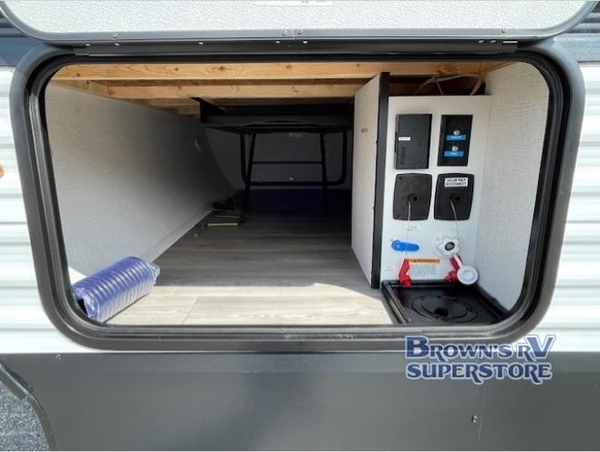 This is the perfect travel trailer if you like to camp with friends and family. Since there are double-size bunks, a queen bed in the front bedroom, plus a booth dinette and sofa, you can sleep eight campers each night! The three burner range and microwave in the kitchen will let you cook meals each day, and the 12V refrigerator will keep your cold items fresh. This model also includes a counter with extra storage underneath, a pull-out trash can storage for convenience, and a full bath to freshen up in each day. And you'll love having your own space in the front bedroom with a privacy curtain, dual wardrobes, and TV prep if you want to add a television!